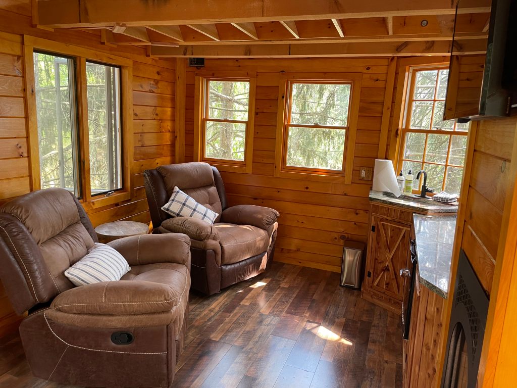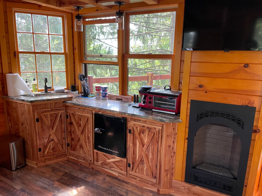 Make a meal on the rainforest granite. Watch a movie while you eat. Enjoy the nature around you. Or if it’s chilly, start the propane fireplace.